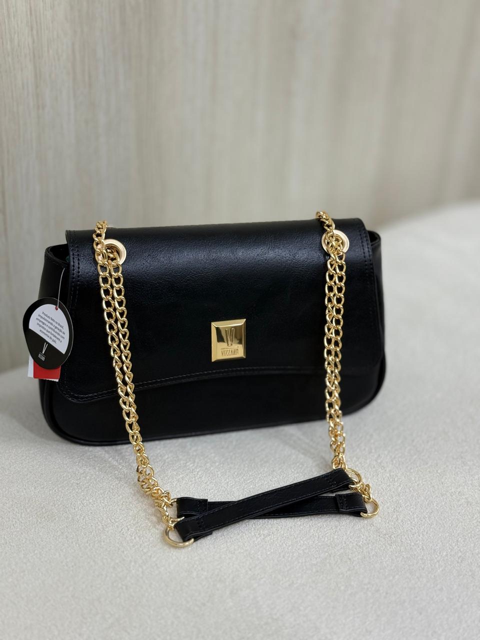 Elegante e versátil, a bolsa Vizzano preta é perfeita para completar seus looks com sofisticação. Confeccionada em material sintético de alta qualidade, possui design clássico com acabamento liso e detalhe em metal dourado com o logo da marca. A alça em corrente dourada adiciona um toque de charme e modernidade, ideal para usar tanto no dia a dia quanto em ocasiões especiais. Fecho com aba frontal e ótimo espaço interno para guardar seus itens essenciais com estilo.