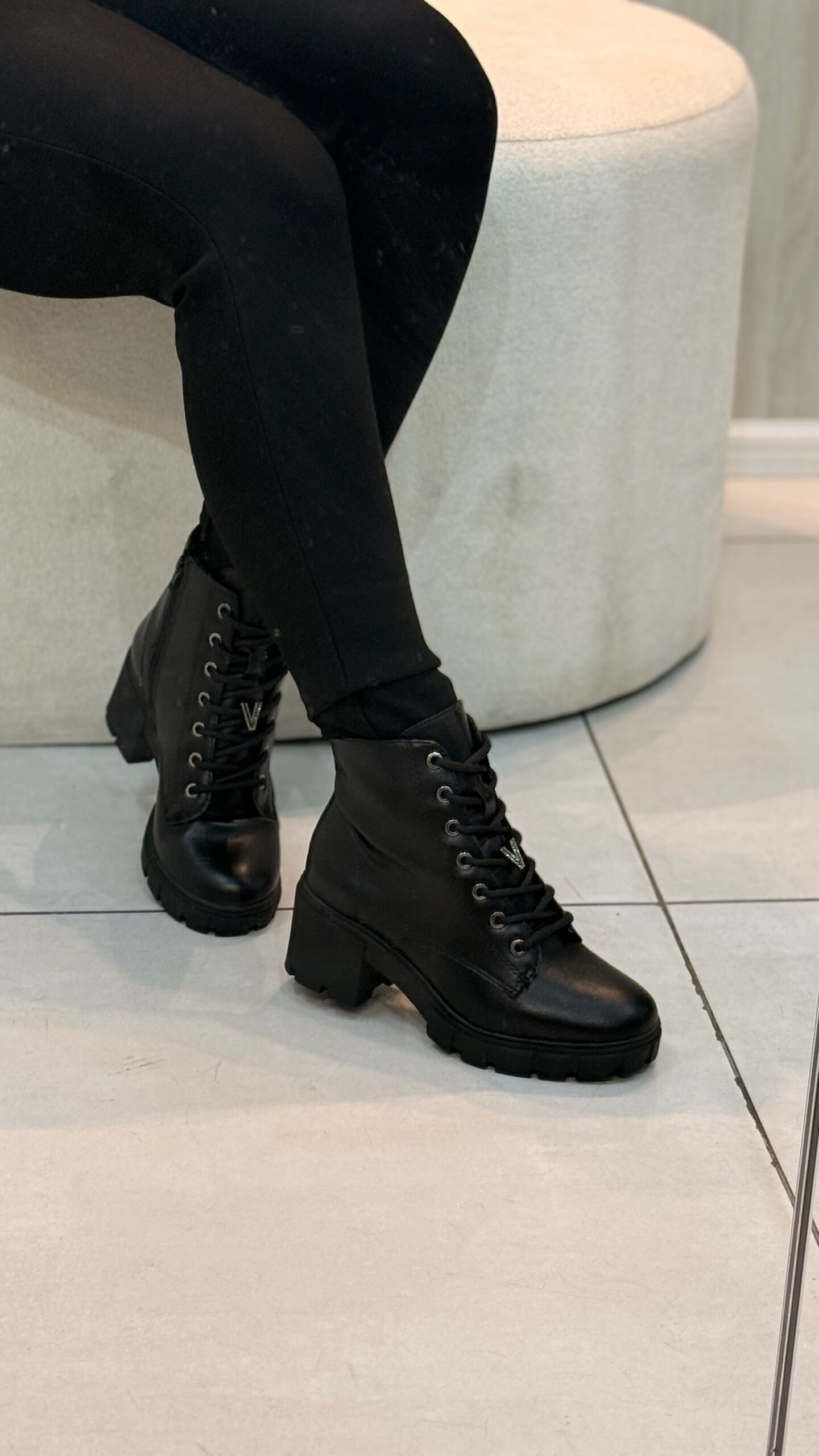 Design: Possui bico redondo e fechamento por zíper na lateral, cadarço com detalhes de ilhós.