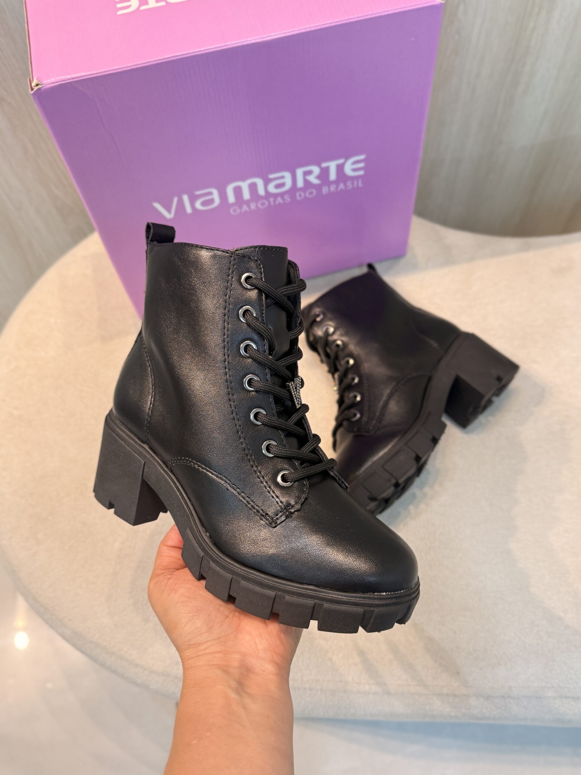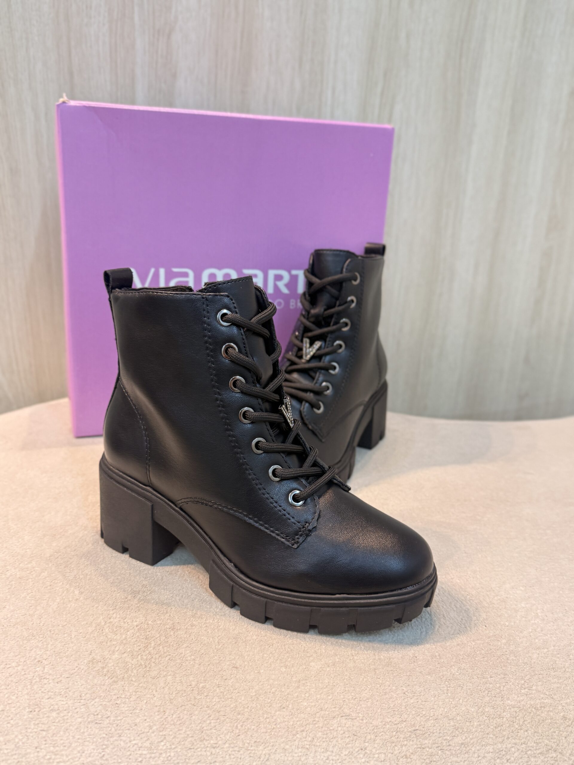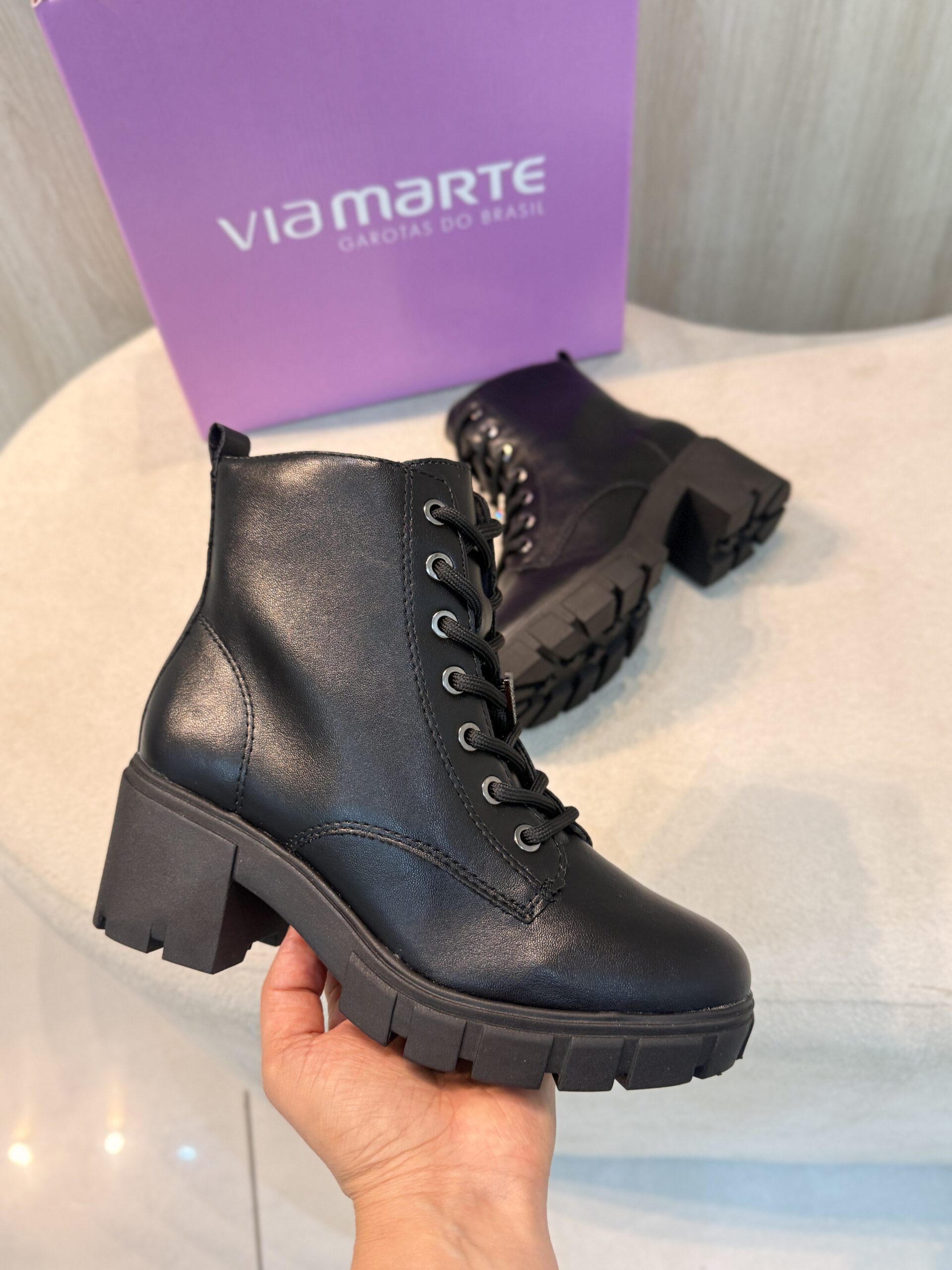 Coturno Feminino da Via Marte, caracterizado pelo seu design tratorado e salto bloco médio.