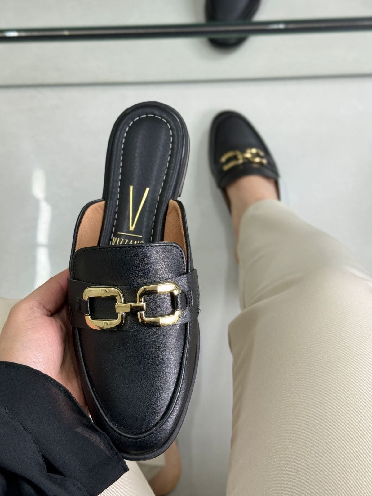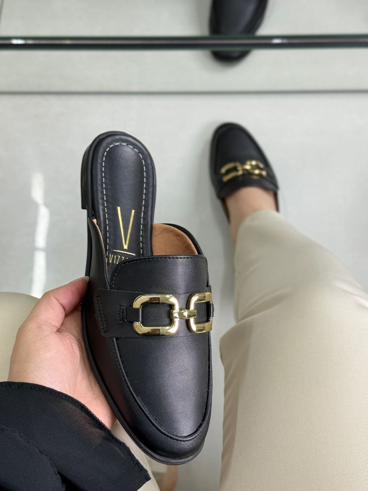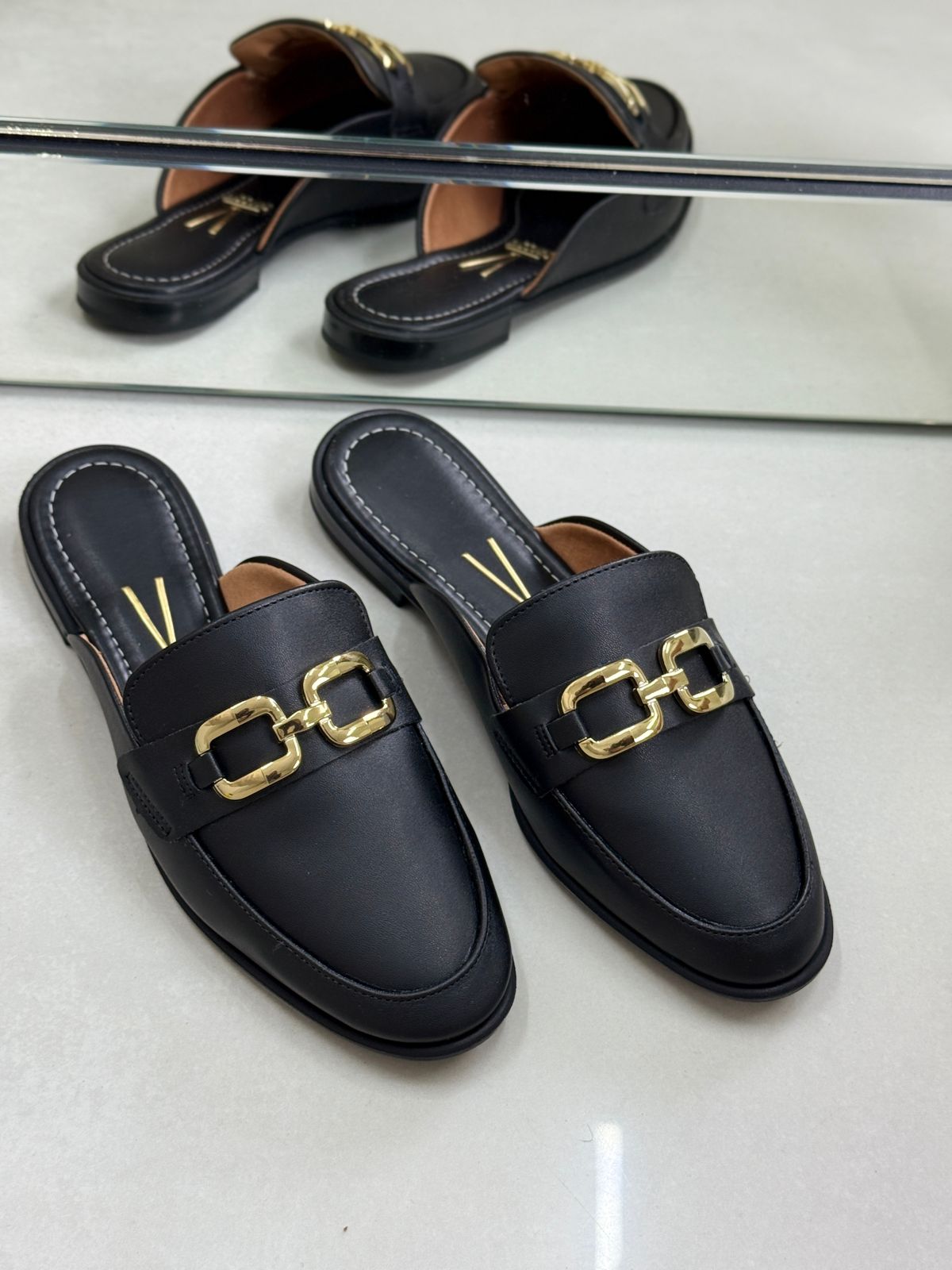Mule Vizzano Preta com Fivela Dourada