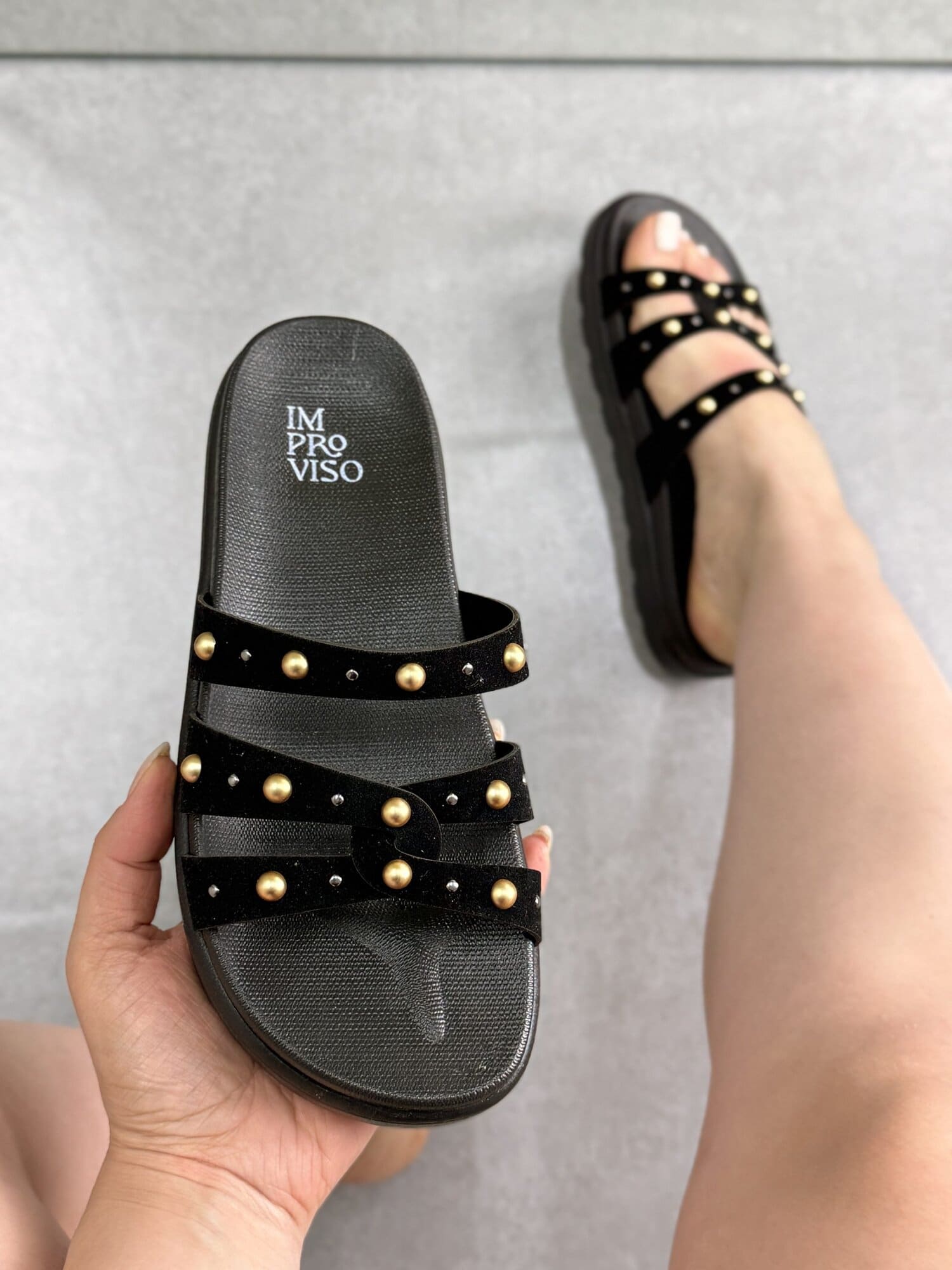 Cheia de atitude, a Papete Preta da ImProviso com tachas douradas é a peça-chave para quem busca um visual moderno com conforto garantido. As tiras em material aveludado preto ganham destaque com aplicação de tachas metálicas, criando um contraste marcante e sofisticado.
