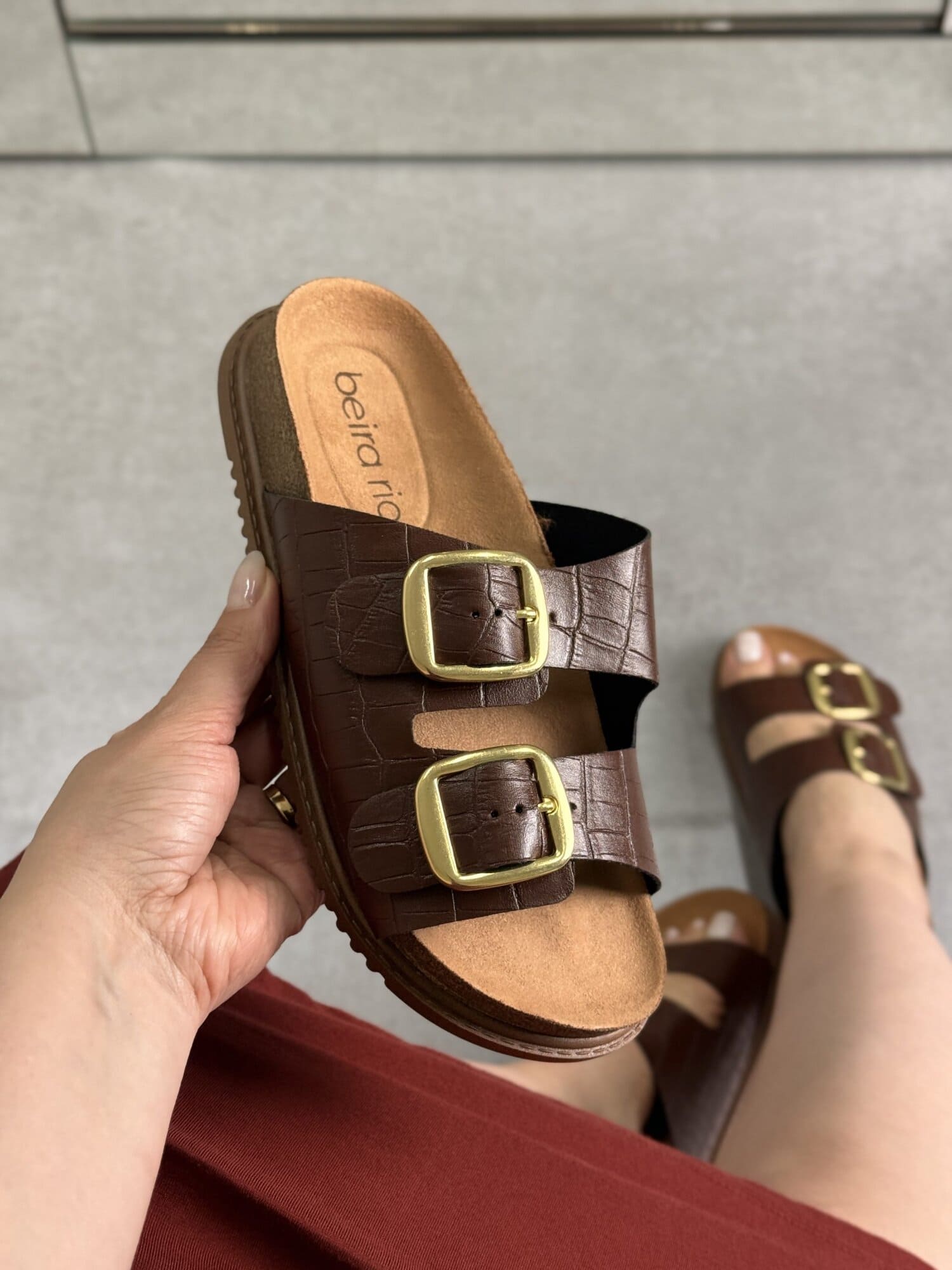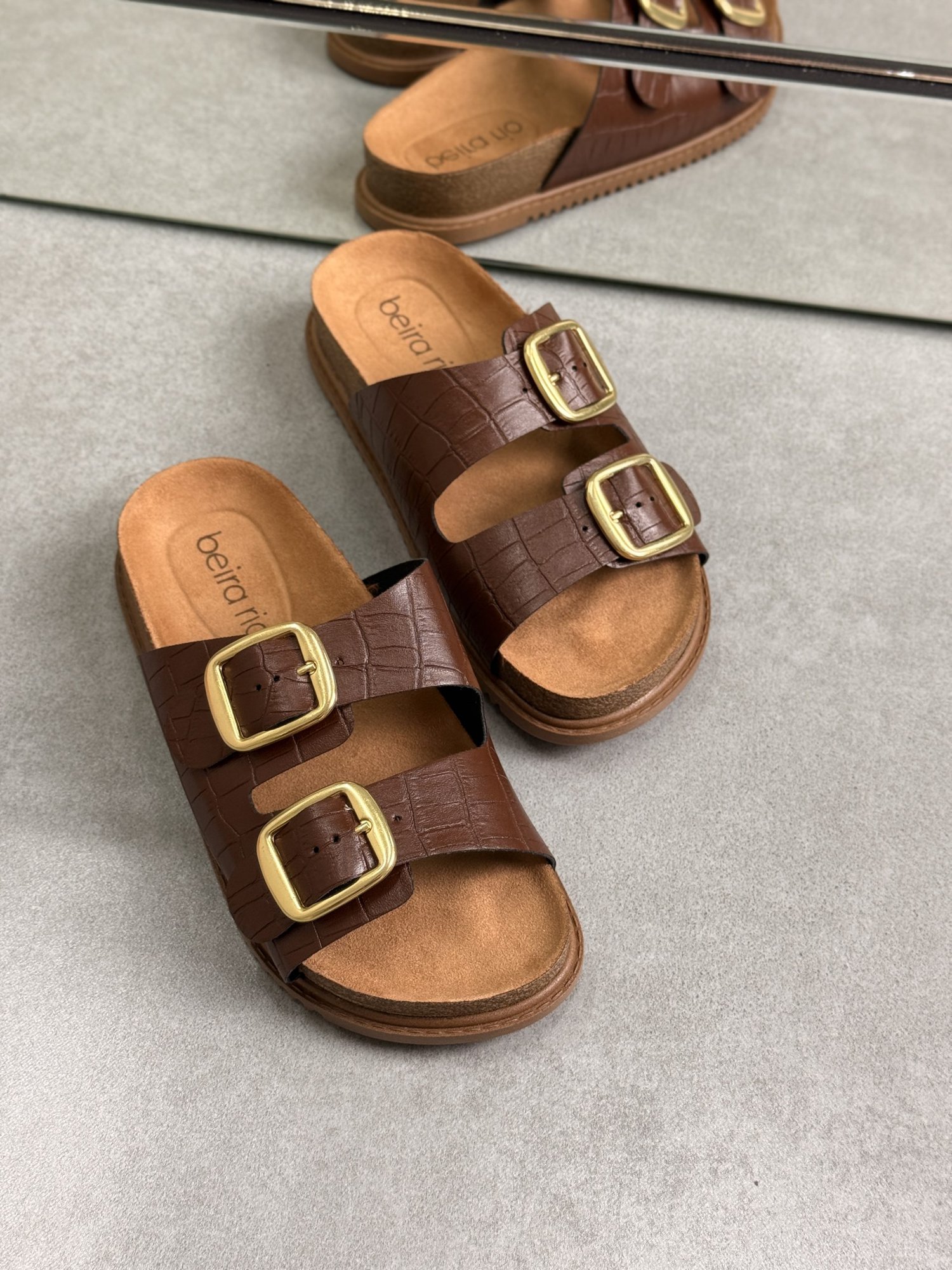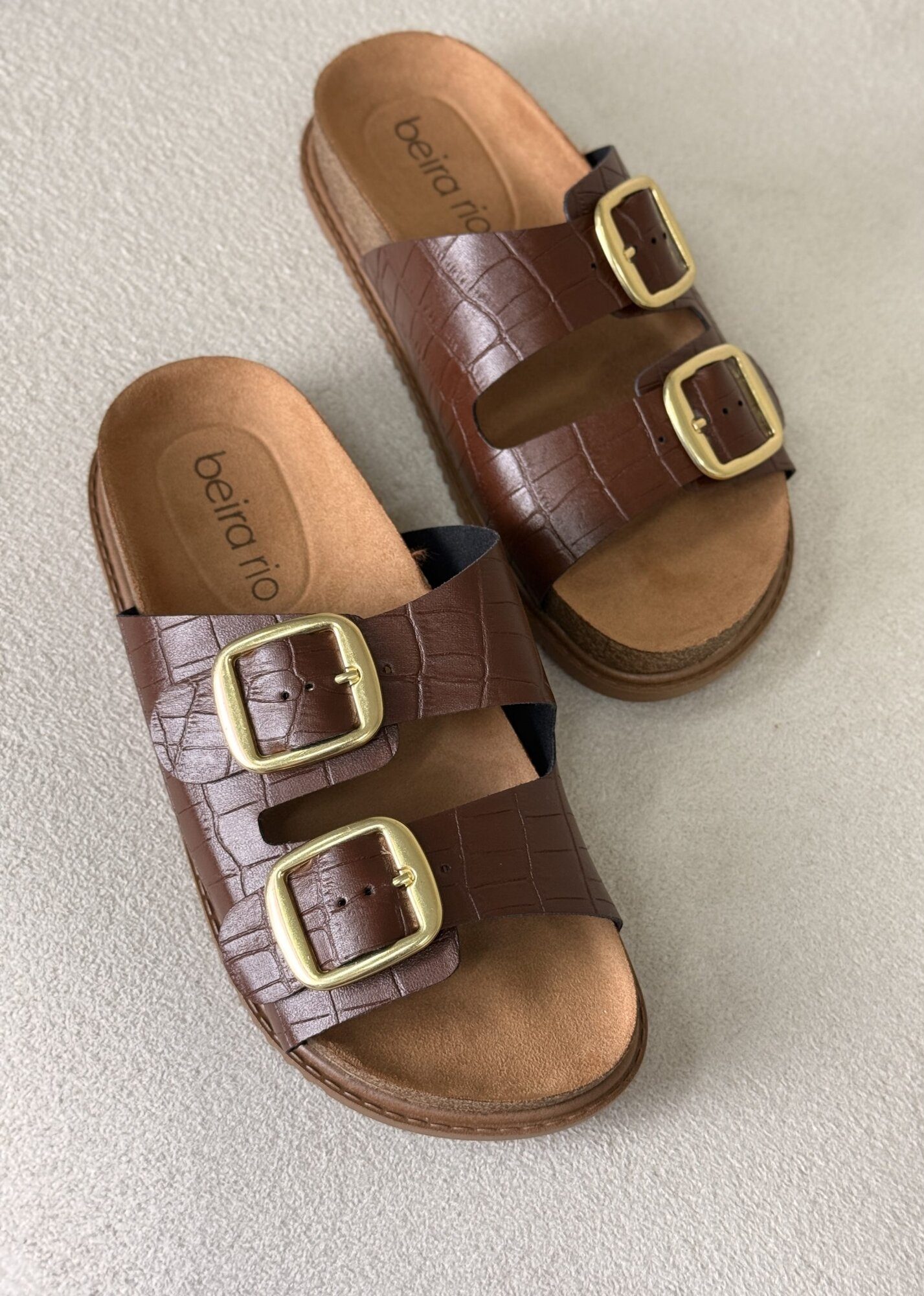 A Rasteirinha Beira Rio é a escolha perfeita para unir estilo e conforto no dia a dia. Confeccionada em material sintético marrom com textura que remete ao croco, conta com duas tiras largas ajustáveis e fivelas douradas que trazem um toque moderno e sofisticado ao design. O solado anatômico garante bem-estar durante o uso, tornando o modelo ideal para looks casuais e práticos, sem abrir mão da elegância.