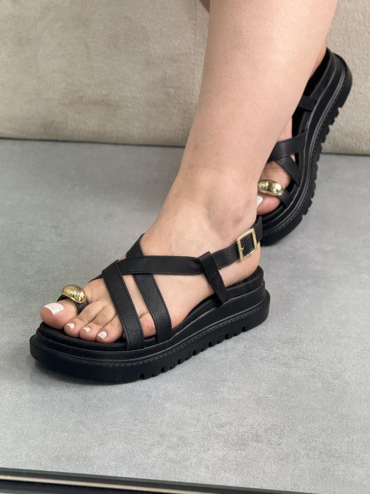 A Sandália Modare une praticidade e estilo em um design moderno e confortável. Confeccionada em material sintético preto, possui tiras cruzadas que oferecem melhor ajuste ao pé e detalhe dourado na parte frontal, garantindo um toque sofisticado ao modelo. O solado anatômico proporciona leveza e bem-estar para o dia todo, sendo ideal para quem busca conforto sem abrir mão da elegância no dia a dia.