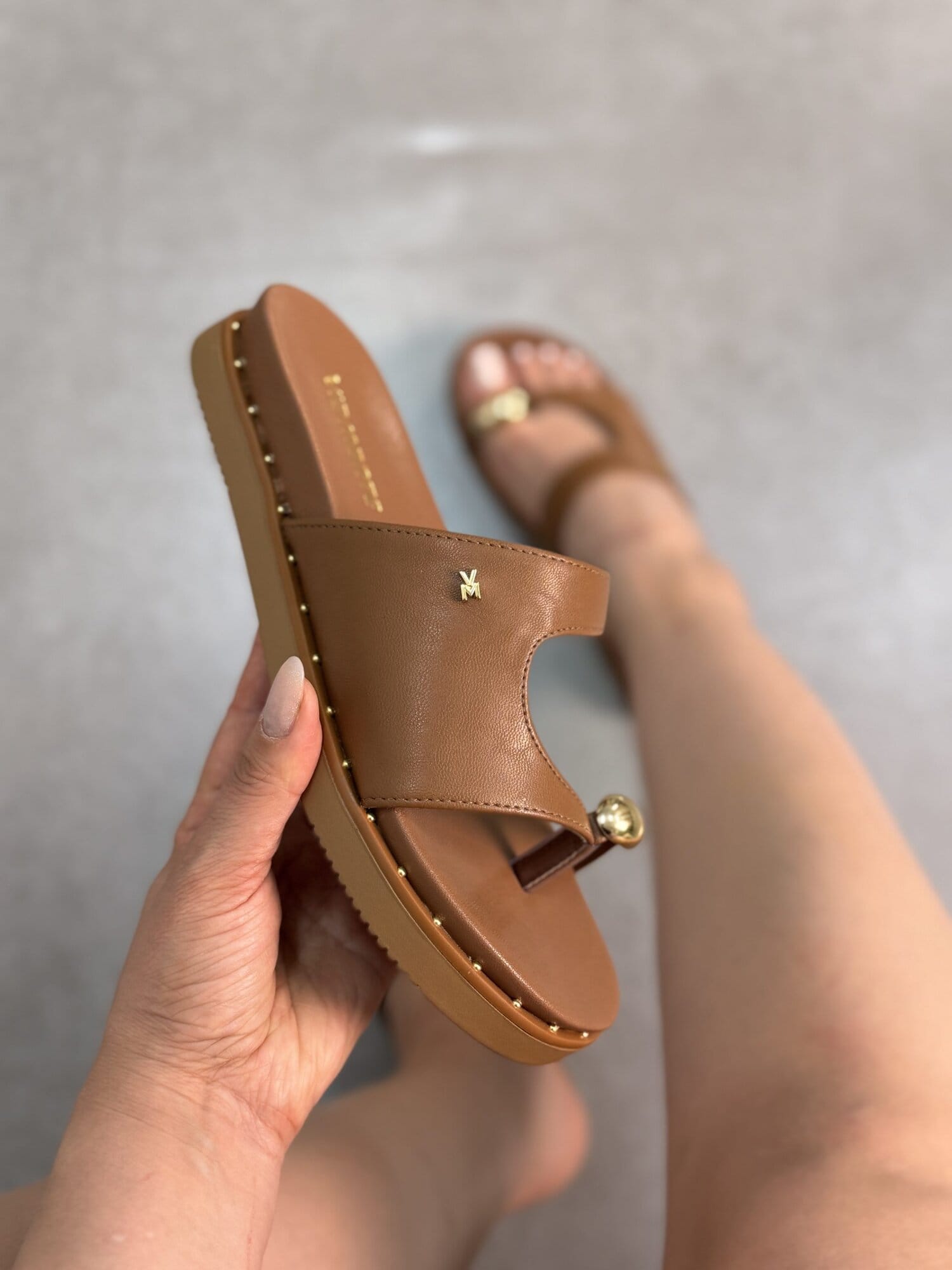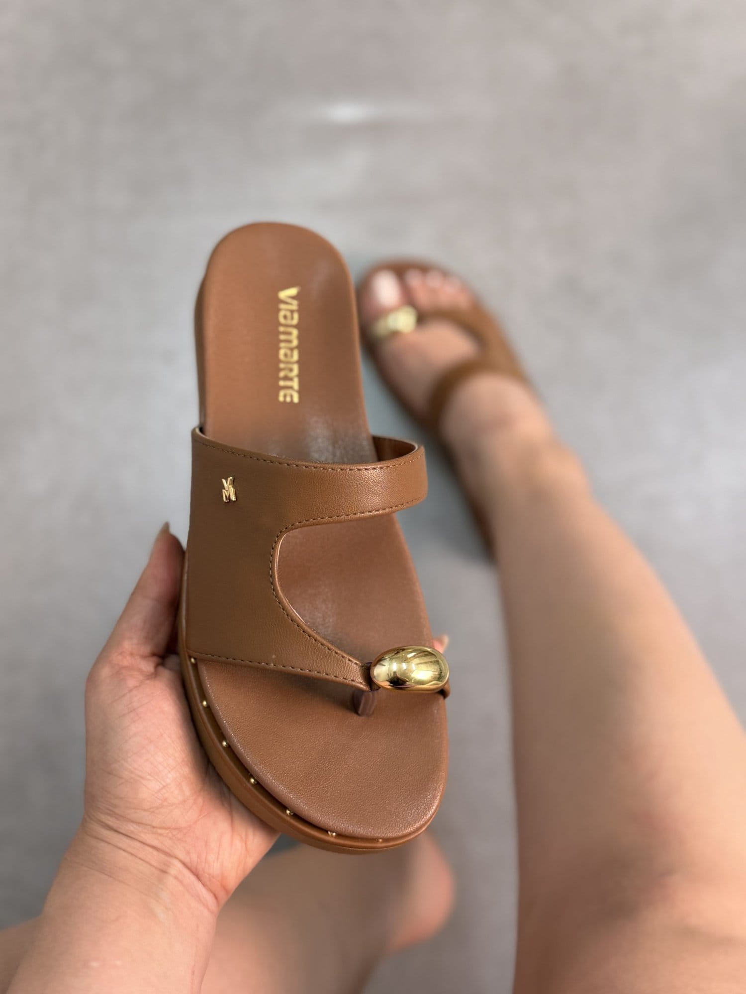 Rasteirinha Via Marte Caramelo com Detalhe Dourado