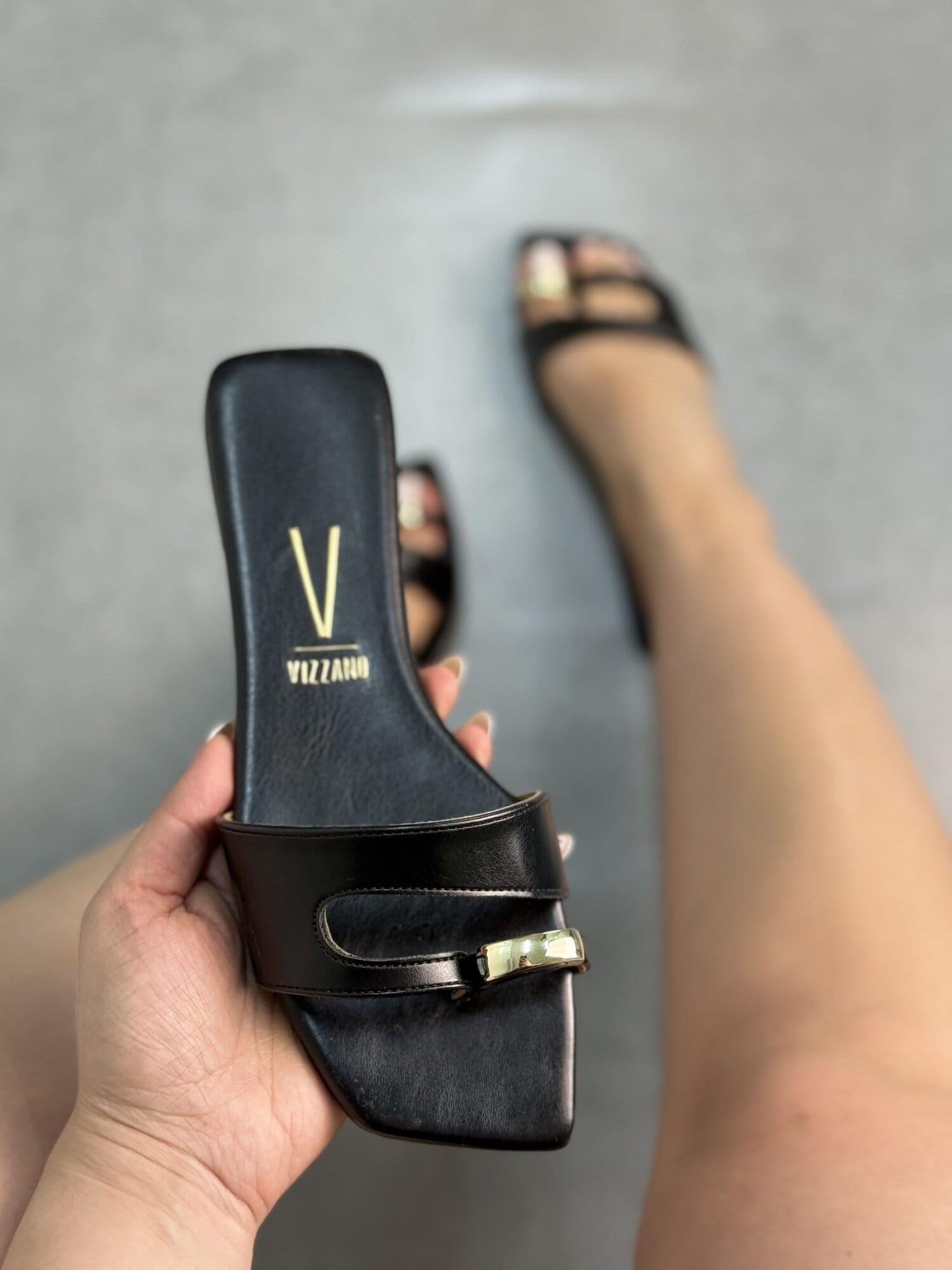 A Rasteirinha Vizzano Preta é sinônimo de elegância e conforto para o dia a dia. Com design moderno e sofisticado, o modelo apresenta tira larga com recorte estilizado e detalhe metálico dourado, que traz um toque de charme e luxo ao visual. Sua palmilha macia e o formato quadrado na ponta garantem estilo e bem-estar em cada passo. Ideal para compor produções casuais ou mais refinadas com muito bom gosto.