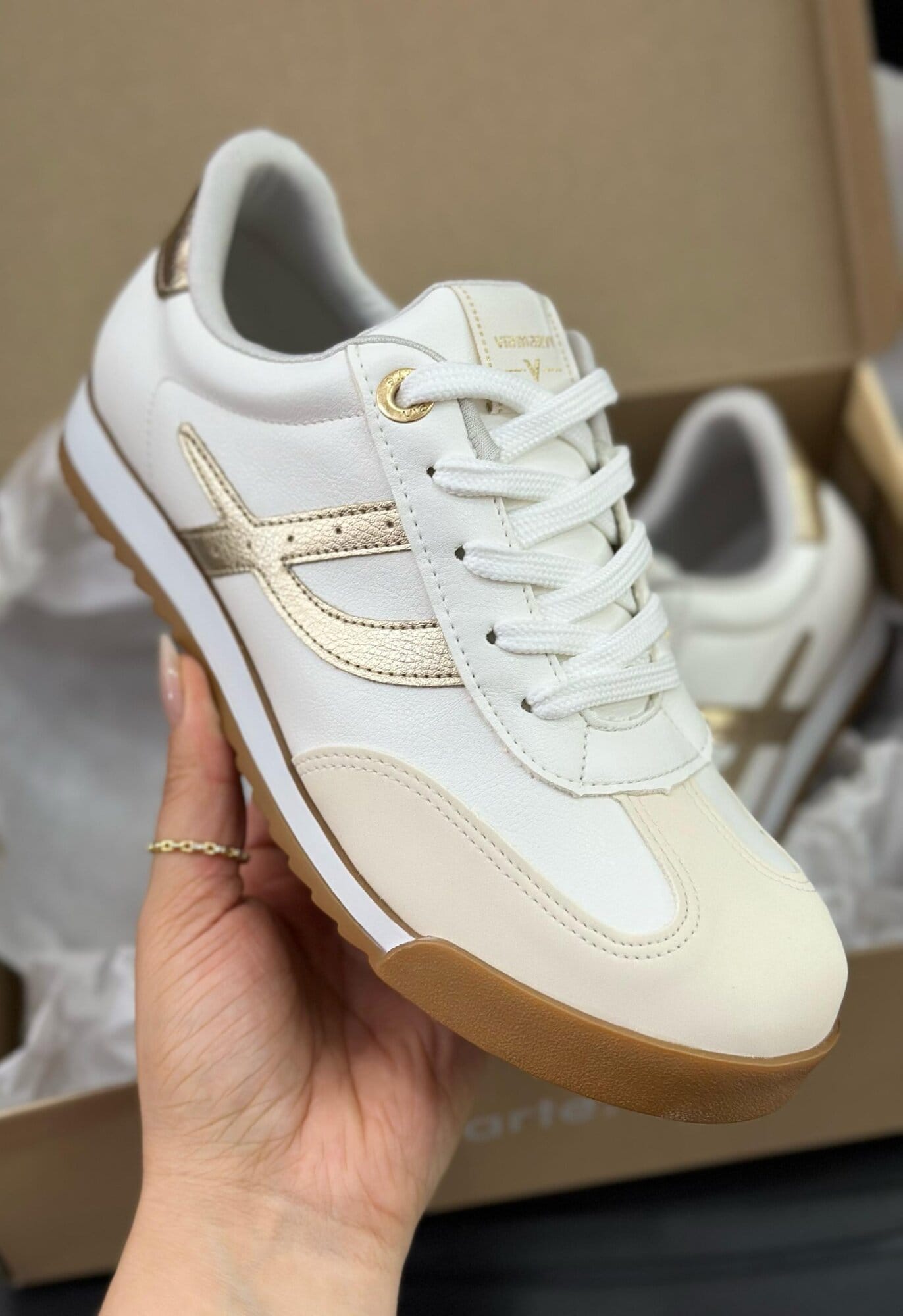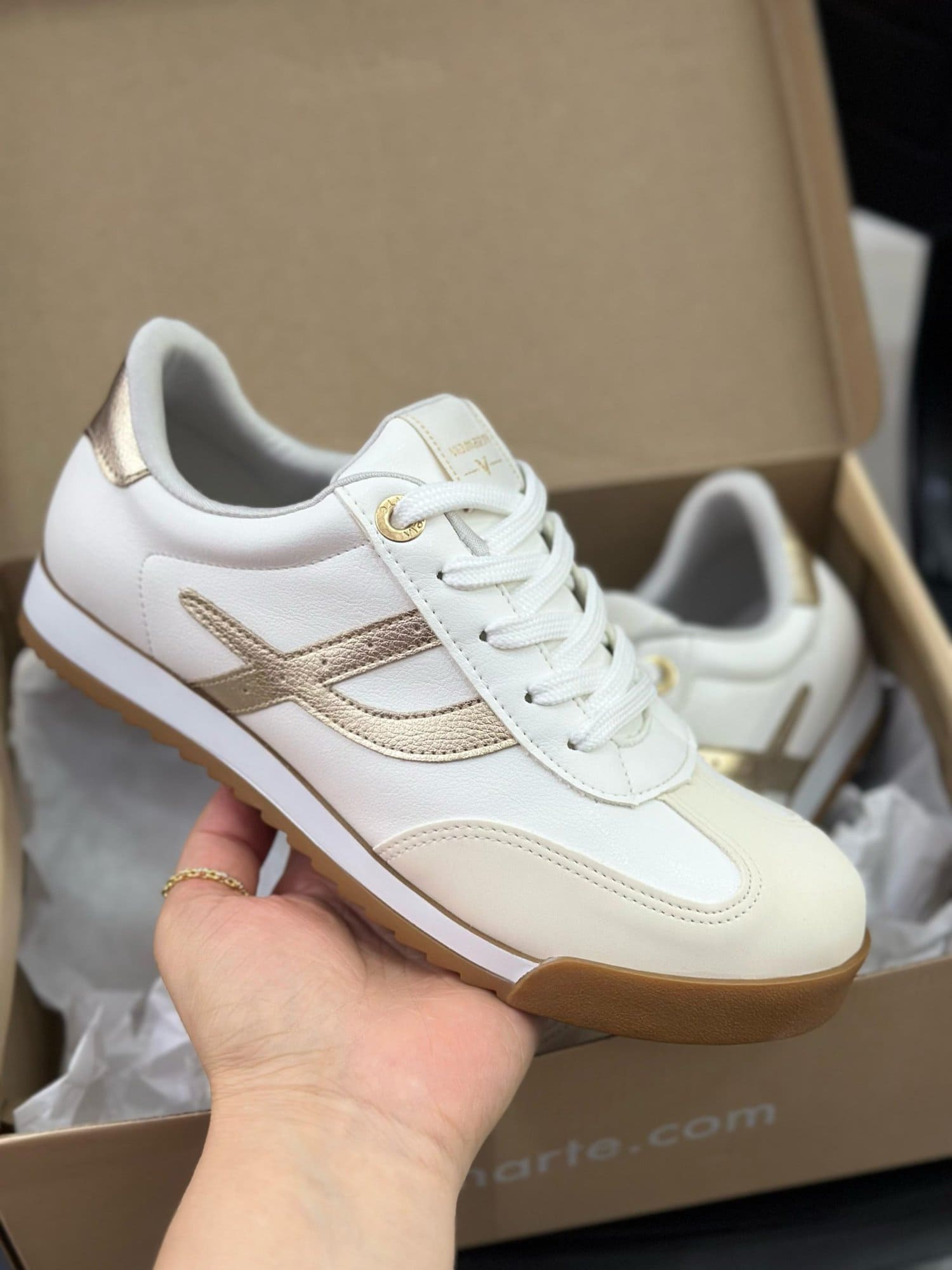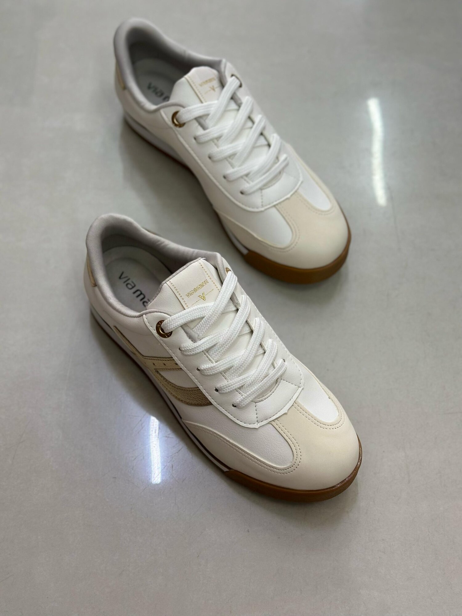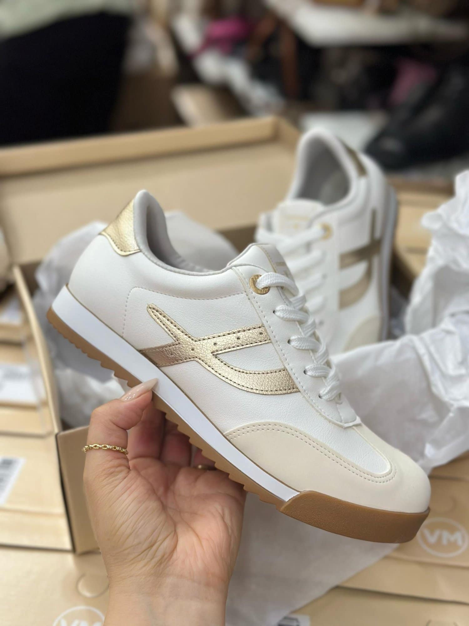 O Tênis Via Marte Branco com Detalhes Dourados é a escolha ideal para unir conforto e estilo em qualquer ocasião. Confeccionado em material sintético de alta qualidade, traz um design moderno com recortes metalizados em dourado que garantem um toque sofisticado ao visual. O solado emborrachado oferece segurança e estabilidade, enquanto o cadarço ajustável proporciona praticidade e ajuste perfeito aos pés. Um modelo versátil que combina facilmente com looks casuais e despojados.