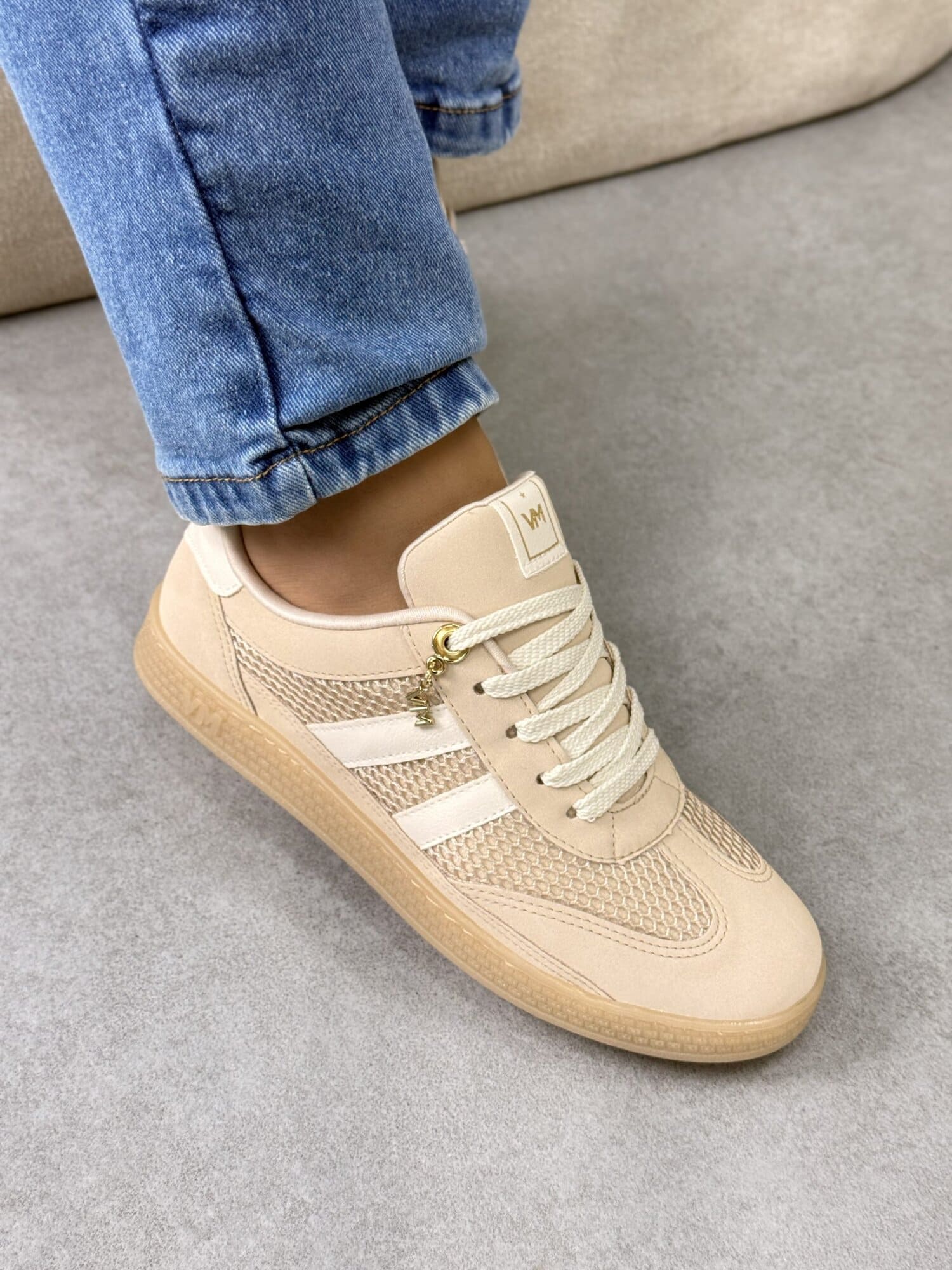 Sua cor neutra bege é super versátil e fácil de combinar, enquanto o solado emborrachado garante segurança e estabilidade na pisada. O acabamento em camurça sintética e os detalhes dourados trazem um toque de sofisticação que eleva qualquer look.