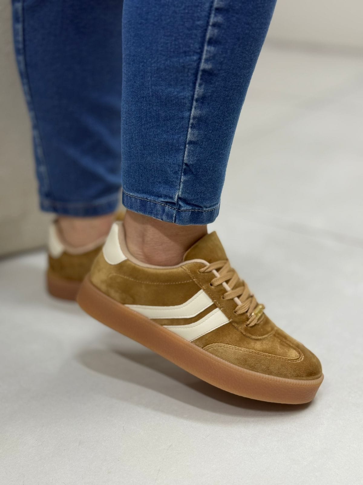 O tênis perfeito para quem busca conforto com estilo! Este modelo da Vizzano é confeccionado em suede macio na cor caramelo, com detalhe lateral em off white que adiciona um toque moderno e versátil ao visual. Seu solado emborrachado garante segurança na pisada, enquanto o interior acolchoado proporciona máximo conforto para o dia a dia. O charme extra fica por conta do detalhe dourado com o logo Vizzano nos cadarços, que traz elegância na medida certa.